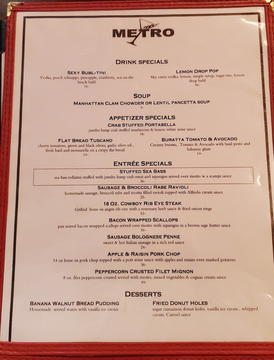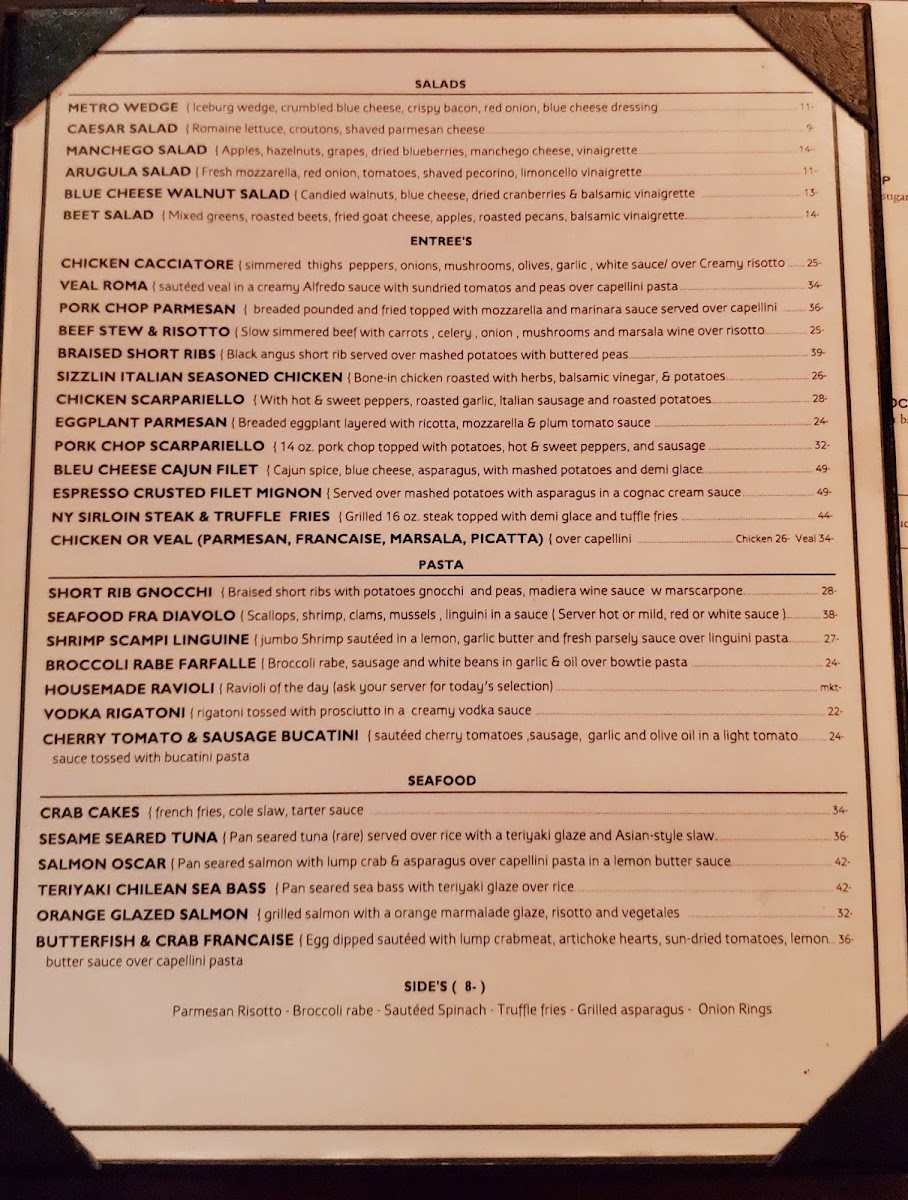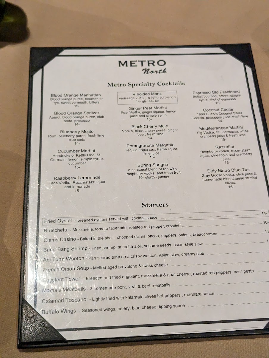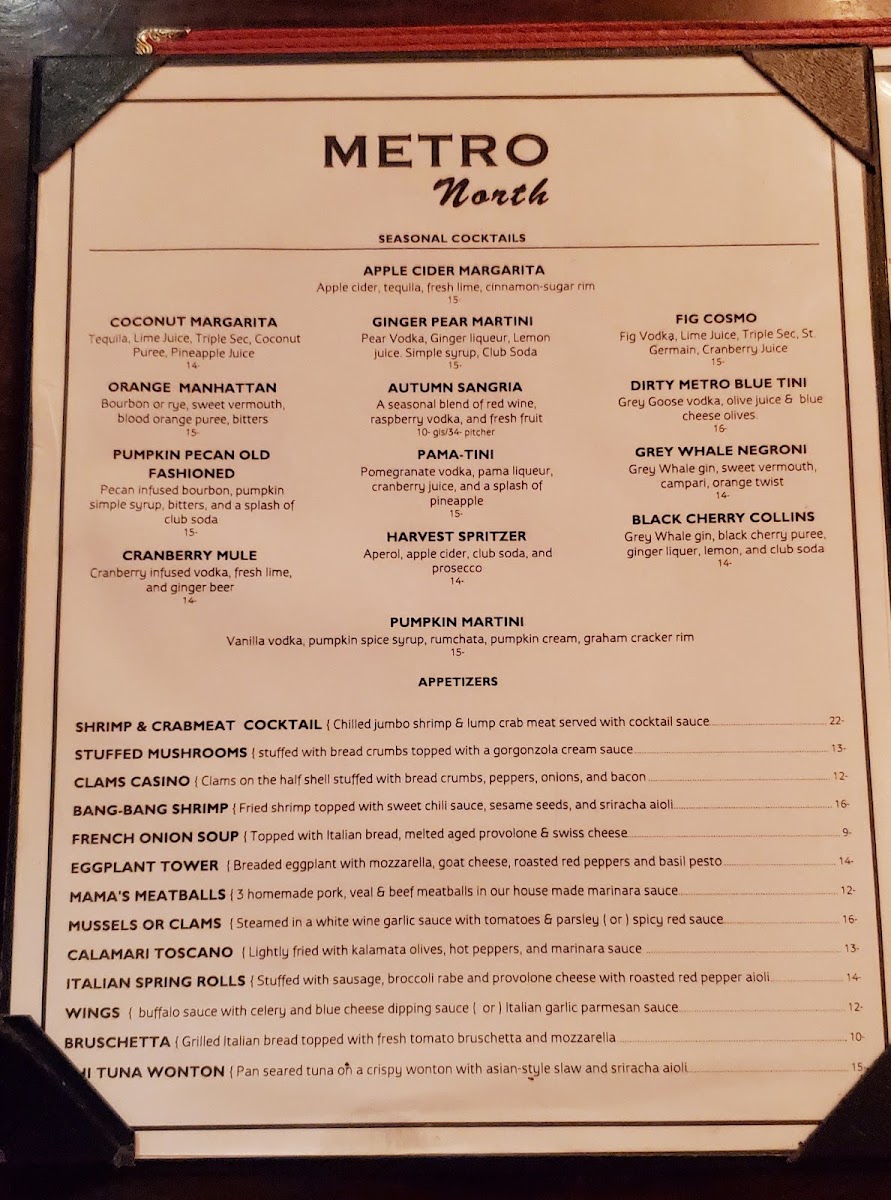Metro North offers a thoughtfully curated menu that balances traditional Italian flavors with hearty bar & grill comforts. The selection moves smoothly from casual appetizers and fresh salads to satisfying entrees and rich desserts, making it easy to find something for an easy weekday dinner or a special weekend night out.