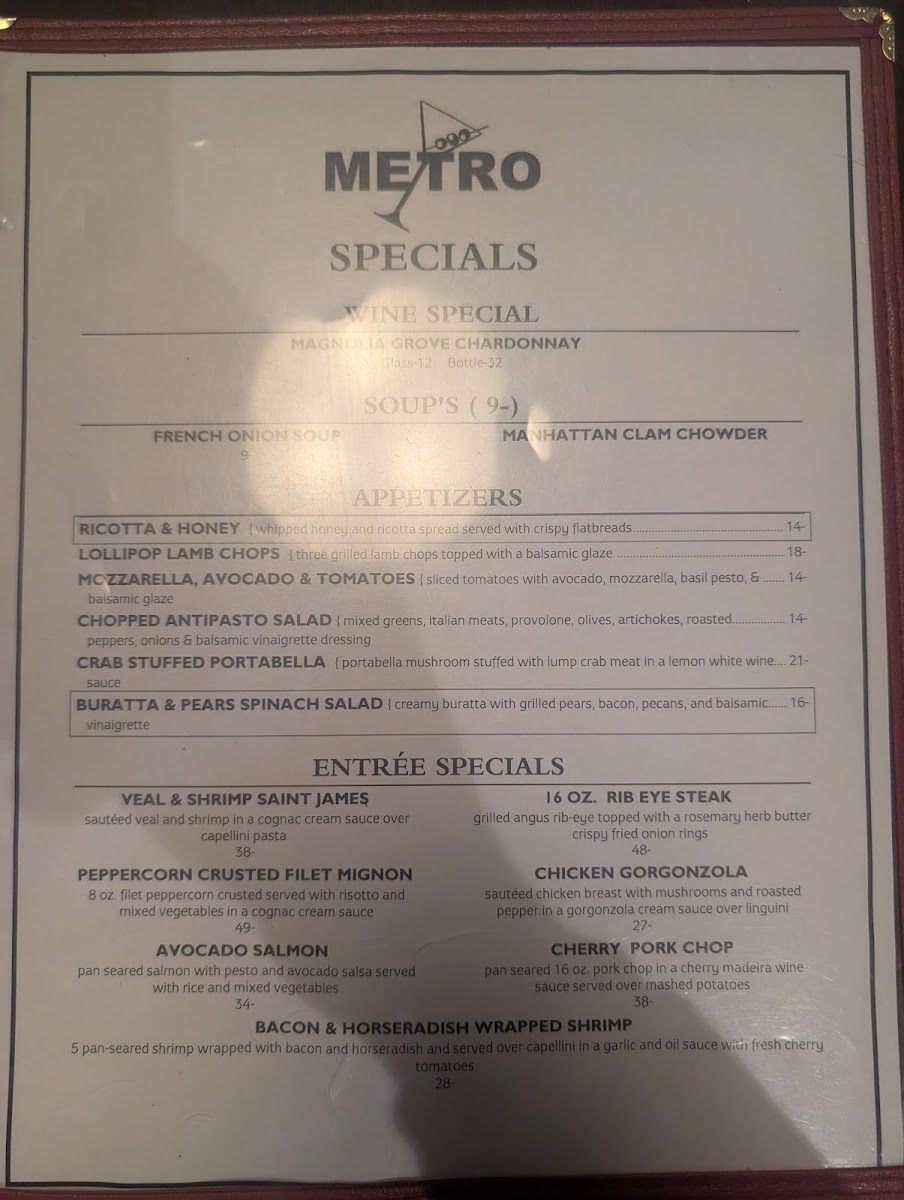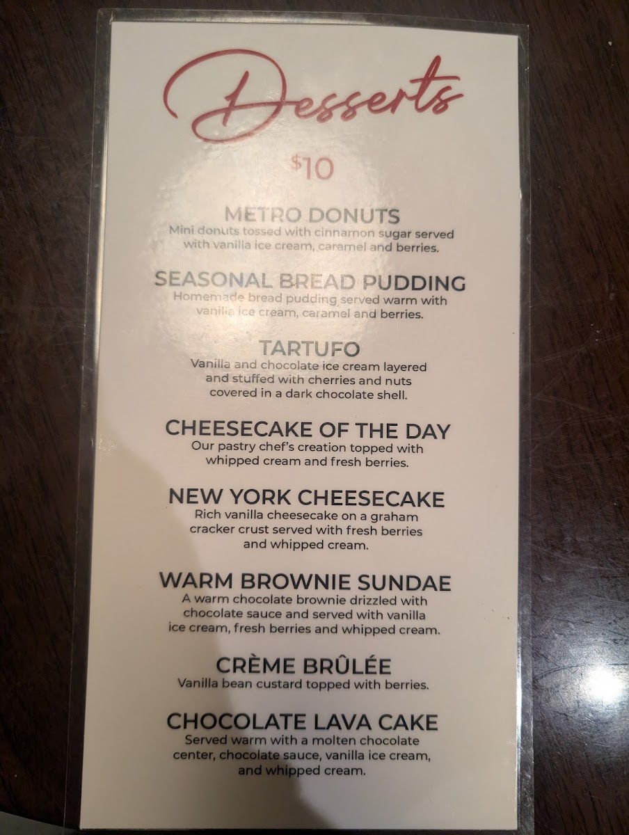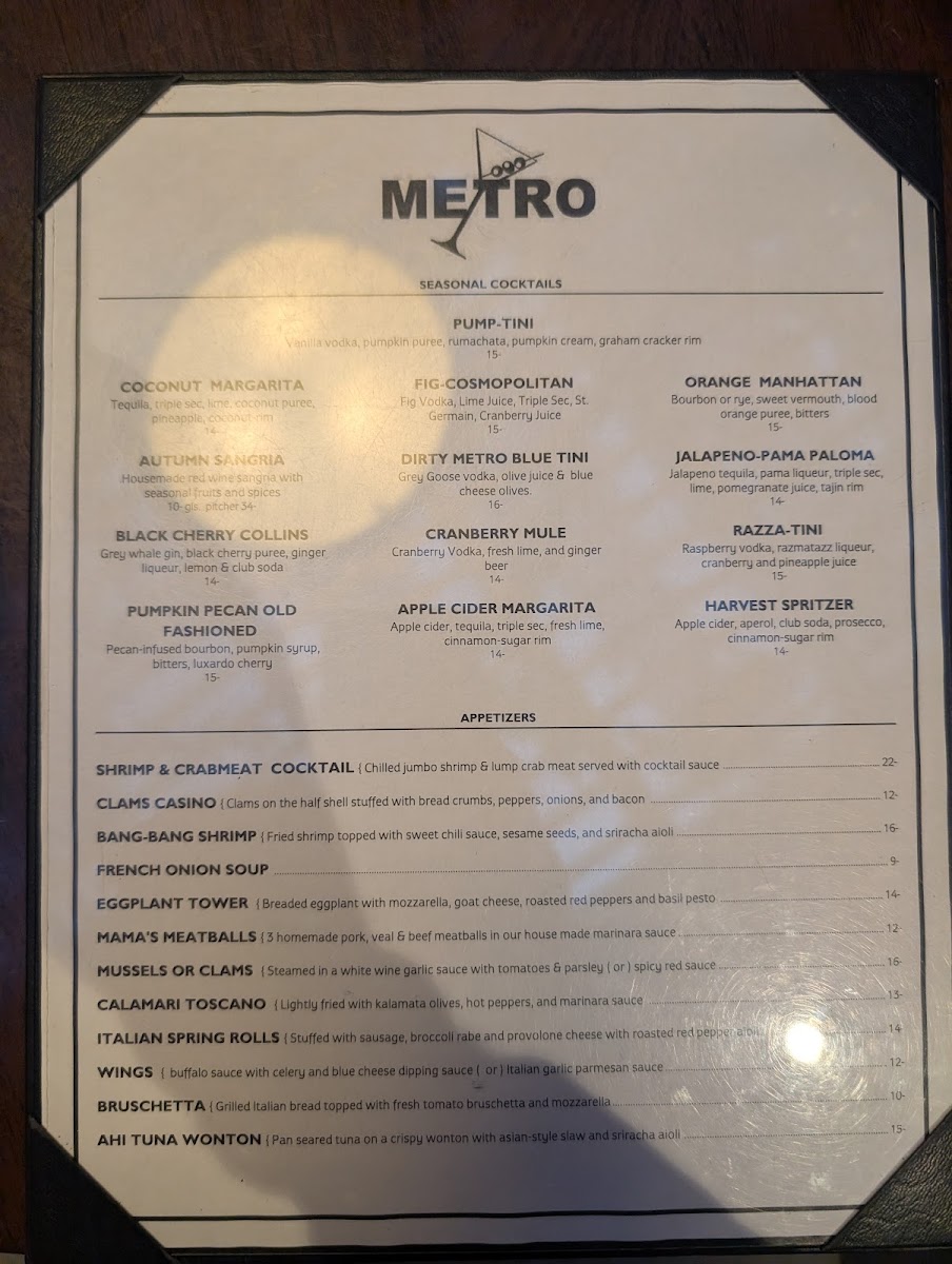 Metro North offers a thoughtfully curated menu that balances traditional Italian flavors with hearty bar & grill comforts. The selection moves smoothly from casual appetizers and fresh salads to satisfying entrees and rich desserts, making it easy to find something for an easy weekday dinner or a special weekend night out.